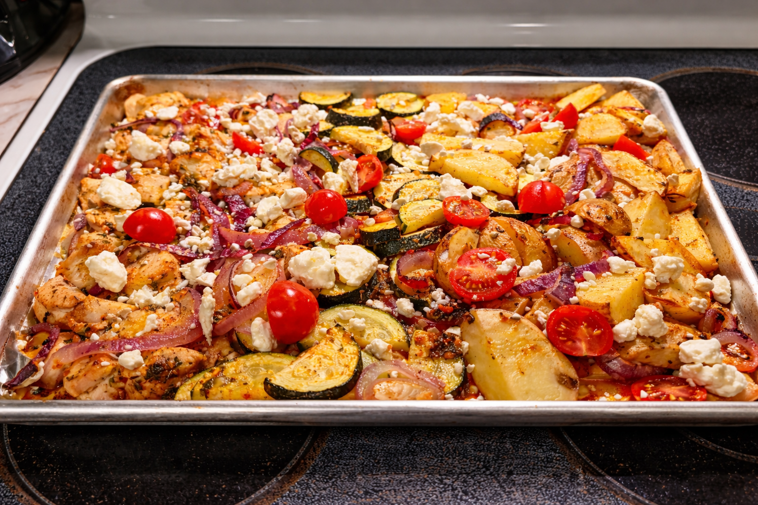 Greek lemon chicken and potatoes roasted with zucchini, bell peppers, red onion, and finished with feta and cherry tomatoes.