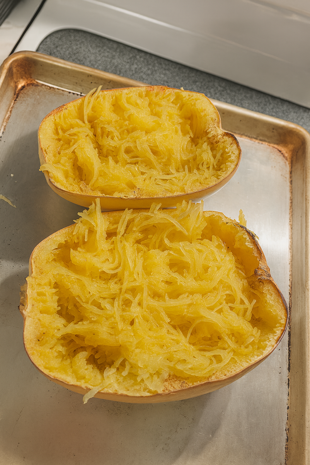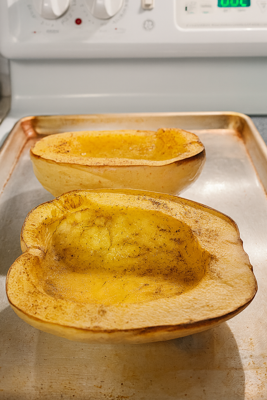 - Roast the spaghetti squash: Preheat oven to 400°F (200°C). Cut squash lengthwise, scoop out seeds, drizzle cut sides with ½ tsp olive oil, and season with salt and pepper. Place cut-side down on a baking sheet and roast 35-40 minutes or until tender. Use a fork to shred into spaghetti-like strands.